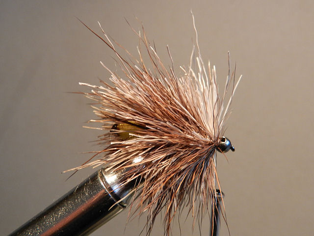 | Nun widmen wir uns dem Gehäuse der Larve. Wie der Name schon sagt, habe ich irgendwann mit Deerhair (Elch oder Hirsch) experimentiert und bin zu guten Ergebnissen gekommen. Büschelweise tastet man sich bis zur Kopfperle heran. Dabei sollte man auf einen engen Sitz der Granen achten. Das Ergebnis sieht dann aus wie oben. Wüst nicht wahr? Ein Abschlussknoten vor der Tungstenperle, der nachher noch mit Bindelack gesichert wird, sichert die Fliege. Auch wenn die Fliege nun wie ein explodierter Handfeger aussieht: Das Endergebnis nach der Behandlung mit der Schere macht sich doch recht gut und überzeugt! | Nun ist der Friseur in ihnen gefragt. Vorsichtig und systematisch stutzen wir nun die Granen, bis das ein zylindrischer Körper entstanden ist. der etwas größer im Durchmesser ist, wie der Larvenkörper. Hierbei tunlichst darauf achten das die Fasanenfibern unserer Schere nicht ebenfalls zum Opfer fallen. Im Grunde wird beim Körper die gleiche Technik wie bei der Goddard Caddis oder der Adams Irressitible verwendet. Fertig ist die Cased Caddis aus Rehhaar. Lediglich noch ein paar Tropfen Bindelack an der Körperbasis und vor der Kopfperle zur Sicherung der Beinchen bzw. des Abschlussknotens fehlen. |