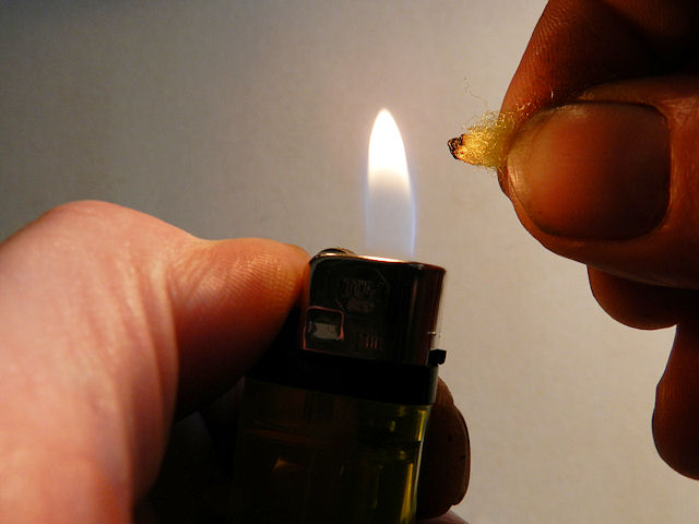 | Als nächstes wird das Antron-Yarn vorbereitet. Um einen Kopf für die Nymphe zu erhalten sängt man es mit der Flamme eines Feuerzeuges oder einer Kerze an. Natürlich funktionieren auch andere synthetische Materialien. Ich verwende hier gelbes Material. Hellgrün oder cremefarben würde aber auch eine recht natürliche Darstellung der Larve erzielen. | Wichtig ist das der Larvenkörper recht gut proportioniert ist. Er sollte nicht zu dünn ausfallen und gut 5 Millimeter über den Hakenbogen hinaus stehen. Das Bündel wird nun am Anfang des Hakenbogens eingebunden. |