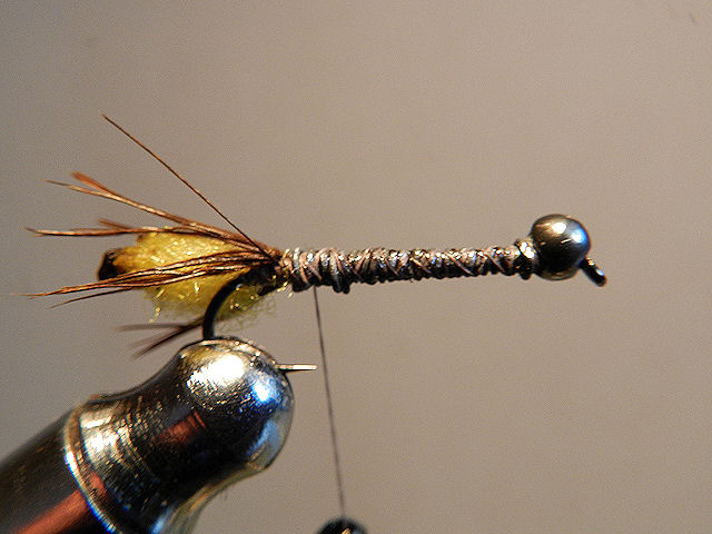 | So eine Köcherfliegenlarve besitzt natürlich auch Beinchen. Diese kann man auf unterschiedliche Weise darstellen. In der Vergangenheit habe ich Rebhuhnnackenfedern benutzt. In diesem Fall habe ich aber auf Fibern einer Fasanenstoßfeder zurückgegriffen. Diese werden so eingebunden, das sie in etwa auf Höhe des Kopfes enden. | Eine solche Nymphe sollte tief fischen, möglichst in Grundnähe. Von daher lehge ich noch eine Wicklung Bleidrahr um den Schenkel des Hakens. Somit ist gesichert, dass genug Gewicht vorhanden ist, um ein schnelles Absinken und einen tiefen Lauf zu gewährleisten. |