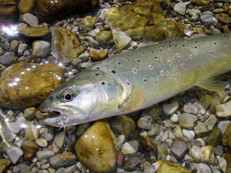 Die erste Traun-Forelle - die Reflektionen des glasklaren Wassers setzen sie effektreich in Szene.